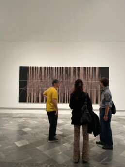 En paralelo, Estefanía Serrano presenta una nueva serie que continúa su investigación geométrica. Partiendo del dilema del “huevo o la gallina”, la artista transforma esta pregunta en una reflexión sobre el origen, la secuencia y la continuidad. Sus piezas, construidas con sistemas de proporción áurea y líneas sobre madera, exploran la tensión entre orden y azar, y convierten la línea en metáfora del pensamiento en proceso.