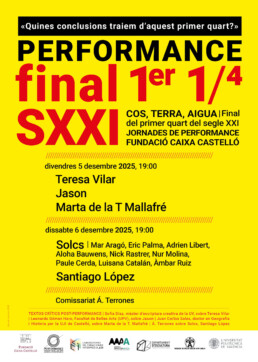 El pròxim divendres i dissabte, 5 i 6 de desembre de 2025, a partir de les 19.00 hores, la Fundació Caixa Castelló celebrarà les seues XI Jornades de Performance a la Sala Sant Miquel COS, TERRA, AIGUA. Serà una trobada d’art d’acció com a expressió generacional del «sentir terra» en aquest final del primer quart del segle XXI. Es tracta d’una proposta artística que ofereix acostar-se a la poesia d’acció, feta per artistes novells i vinculats al territori. Comissariat per Álvaro Terrones