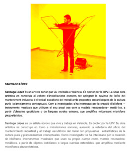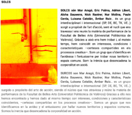 Sofia Díaz, màster d’escriptura creativa de la UV, sobre Teresa Vilar | Leonardo Gómez Haro, professor del Departament d’Escultura de la Facultat de Belles Arts (UPV), sobre Jason | Juan Carlos Sales, doctor en Geografia i Història per la UJI de Castelló, especialitzat en ciències polítiques i conflictes armats, sobre Marta de la T. Mallafré | Á. Terrones, investigador i professor de performance a Belles Arts (UPV), sobre Solcs, Santiago López.